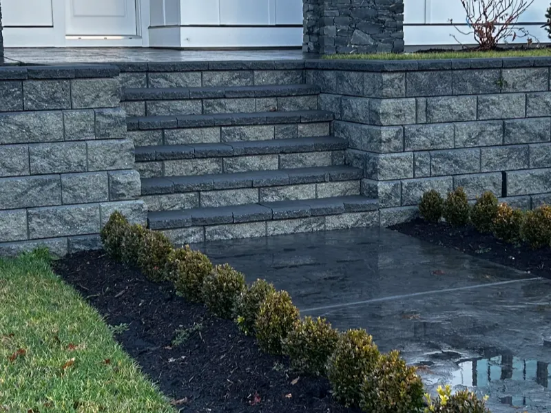 We can integrate steps and stairs using matching materials, such as natural stone or pavers, to ensure a seamless transition between different elevations.