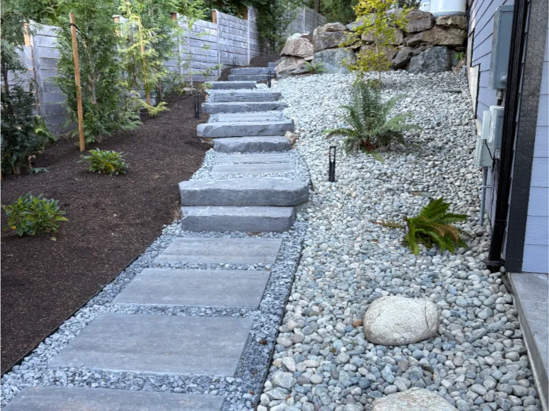 Properties around Greater Victoria often come with unique challenges, sloped lots, exposed bedrock, narrow side yards, and compact urban spaces. We design and install walkways that work with these conditions and feel natural on the property.